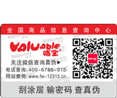 概述:消費(fèi)者在購買已加入電碼防偽系統(tǒng)的企業(yè)所生產(chǎn)的產(chǎn)品時(shí),在產(chǎn)品的包裝上可看到電碼防偽標(biāo)簽。只要揭開標(biāo)識(shí)的表層或刮開標(biāo)識(shí)的涂層,就可以看到一由16位數(shù)字組成的密碼,此密碼是唯一的,只能使用一次,假冒者無法仿造重復(fù)使用。
